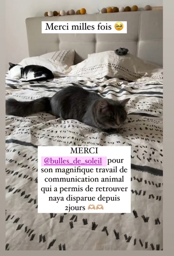 « Mon chat a disparu deux fois en 5 ans et Aurélie m’a toujours donné des informations exactes… Les informations les plus troublantes et fortes se sont révélées lors de la dernière disparition de mon chat. N’hésitez pas à contacter Aurélie.. En plus d’avoir la capacité à se connecter à votre animal, elle est également très douce et a beaucoup d’empathie. Merci Aurélie ❤️ »