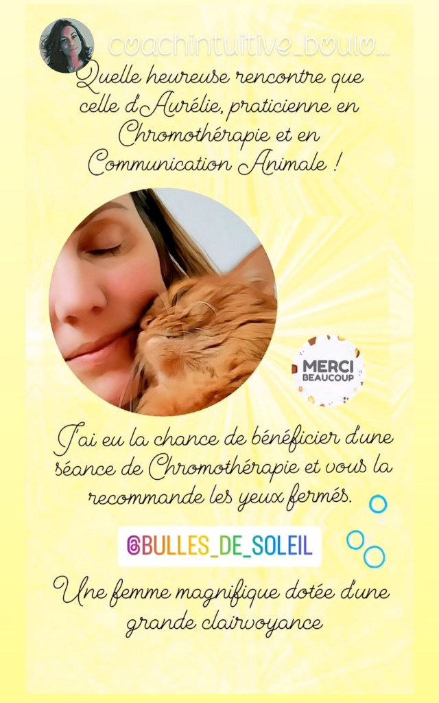 « Quelle merveilleuse expérience Aurélie nous a offert à mes poilus, plumeux et moi 🥰 Tout le monde se sent plus en paix, le soin de chromothérapie a amené beaucoup de douceur et d’amour à chacun. Ce qui a permis une meilleure cohabitation, moins de colère et de nervosité entre chat et chien. Une confiance pour les oiseaux qui sont plus demandeurs de câlins et passent plus de temps en extérieur. Tous les liens se sont resserrés 🥰 Et pour moi ça m’a amené Amour, Puissance, Douceur et résilience 💖 J’ai adoré cette première expérience!! Merci beaucoup Aurélie Bulles de Soleil 🙏🏻🥰 ✨ »